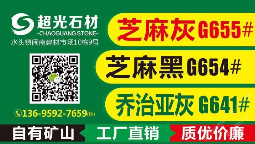 超光石材主營(yíng):654芝麻黑 、G641喬治亞灰 、655芝麻灰 、623芝麻白,大板批發(fā) 、規(guī)格光板、墓碑石 、火燒板、荔枝面、路沿石、菠蘿面、蘑菇石、荒料等各種石制品業(yè)務(wù)